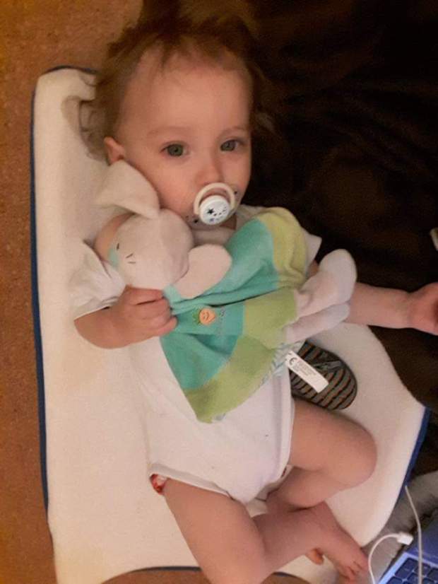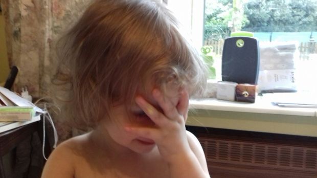 Pieter speelt verstoppertje achter zijn handen. Beetje struisvogellogica. Want als ik hun niet zie, zien ze mij vast ook niet. Zo schattig, deze fase!