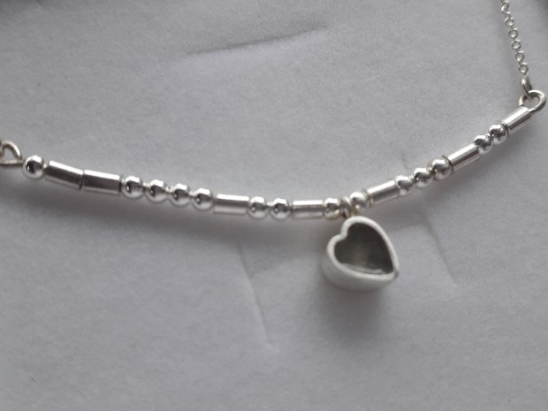 Tot slot nog iets heel bijzonder. Mijn nieuwe ketting. Wat er zo bijzonder aan is? De bolletjes en streepjes die je ziet zijn morsecode. Ze spellen de namen van Pieter en Lena. In het kleine hartje zit moedermelk verwerkt. Het idee voor een ketting als deze heb ik al een hele tijd, van toen Pieter nog een klein babietje was. Maar nu is het eindelijk gerealiseerd. Hier schrijf ik binnenkort nog apart wat over maar ik kon niet wachten om hem al te laten zien.