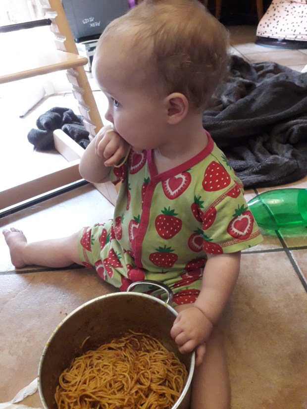Onze kleine dame eet enorm weinig. En dan bedoel ik dat ze echt nog 99,9% overleefd op borstvoeding. Eten interesseert haar gewoon niet. Hier had ik een idee. Ik stond er niet helemaal achter maar na zoveel tijd probeer je al eens wat. Ik zette de tv op, zette “per ongeluk” de pot pasta naast haar op de grond. En ze ging gewoon – afgeleid als ze was – eten!