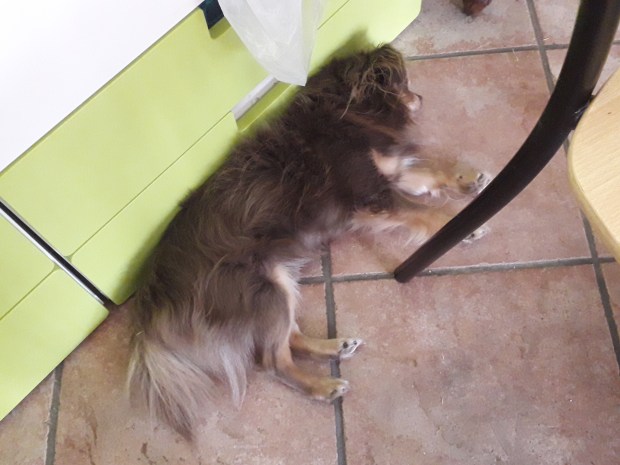 Wij zijn niet de enigen die het warm hebben de laatste tijd. Ook de hondjes hebben er heel veel last van en zoeken verkoeling op de – iets frissere – vloer. Arme flepkes. Chinese naakthond Blissje willen we nog laten scheren, zodat ze het wat frisser krijgt, maar een chihuahua als Buddy scheer je niet zomaar kaal toch…