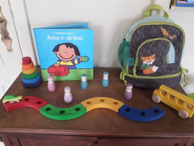 Wat nu onze bedoeling is van deze tafel? De schildpad blijft nog even vooraan in de ring – of ja, slinger – staan. De laatste 11 nachtjes voor de school mag hij elke avond voor het slapen gaan 1 stapje naar voor. Zo tellen we samen af. We zullen dit jaar dus beginnen op donderdag 23 augustus. Met het boekje zijn we wel gisteren al begonnen om te lezen voor het slapen gaan. Zijn boekentasje staat klaar, omdat hij dit kent van de paar weekjes die hij vorig schooljaar al geweest is. Zo wordt hij hier terug aan herinnerd.
