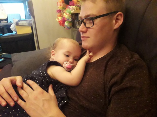 Lena knuffelt heerlijk met haar peter Nonke Michiel. Ze viel zelfs bijna in slaap. Het staat hem wel, zo een baby. 😉