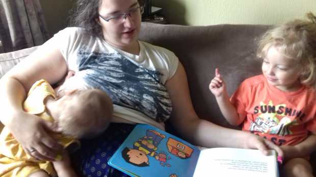 Multitasking zoals alleen een echte vrouw dat kan. Lena eten geven, haar begeleiden in haar turnoefeningen aan de borst, Pieter een verhaaltje voorlezen en tegelijk manlief instructies geven. Een doorsnee maandagmorgen lijkt het wel