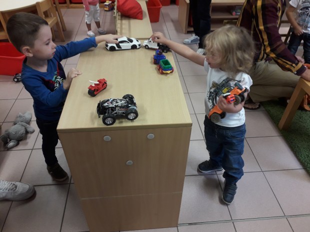 Het schooljaar begon met een soort toneeltje waarbij de kinderen van de school gingen raden wie verklede leerkrachten waren. Erg leuk, maar misschien niet ideaal voor de allerkleinsten. Daarna mochten we de kindjes in de klas afzetten. Daar ging hij spelen met vriendje Vince! Helaas ging het stiekem wegsluipen minder goed en volgde hij ons naar de deur. Na een extra dikke knuffel en afleiding van de juf ging het gelukkig wel goed.