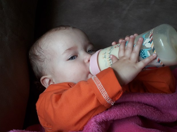 En alweer de laatste foto voor vandaag. Lena die in de zetel ligt met een flesje melk. Een enorm grote fles zou je zeggen. En dat klopt. Deze grote fles drinkt ze uiteraard niet in één keer leeg, maar die staat altijd binnen handbereik. Ze doet er een halve dag over ongeveer om hem leeg te krijgen. Bovenop al haar andere eetmomenten – die vaak ontelbaar zijn.