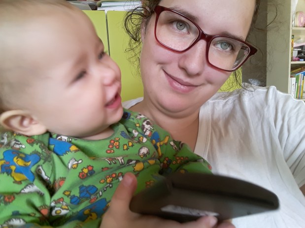 Lena vindt het heerlijk om bij mij op schoot te zitten en te spelen met alles wat ik vast heb. Ze kan zo heerlijk gieberen. Hier heeft ze de kaartlezer vast, die ze als telefoon gebruikt.