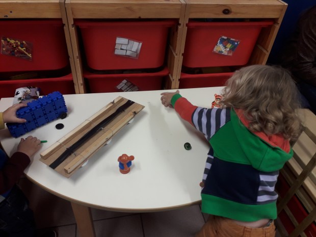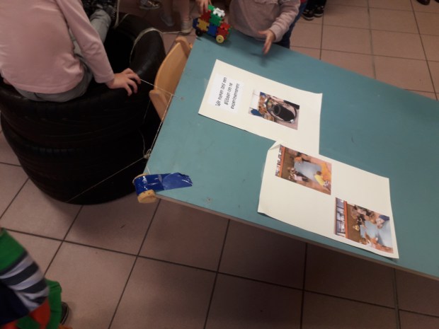 Het techniekproject begon met het verzamelen van kosteloze materialen, blokken, treinsporen, autobanden, … . Van alles wat er maar mogelijk is om dingen in elkaar te knutselen en zelf dingen te ondervinden dus. Bij het verzamelen van natuurmaterialen gingen de kindjes spontaan van een heuvel rollen, waarbij de dialoog op gang kwam over wat er nog (al dan niet van een heuvel) kon rollen. Ook bij een klaspoppentoneel moest er van de kinderen uit een oplossing voor een probleem gezocht worden. Al deze dingen samen leiden tot het onderwerp “Wat kan er van eeb glijbaan rollen?”.