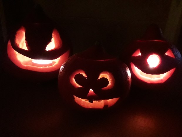 Jelle en ik besloten om samen pompenen uit te snijden voor Halloween/Samhain. Een heel leuke bezigheid toen de kindjes sliepen, en het resultaat mag er toch wel zijn vind ik.