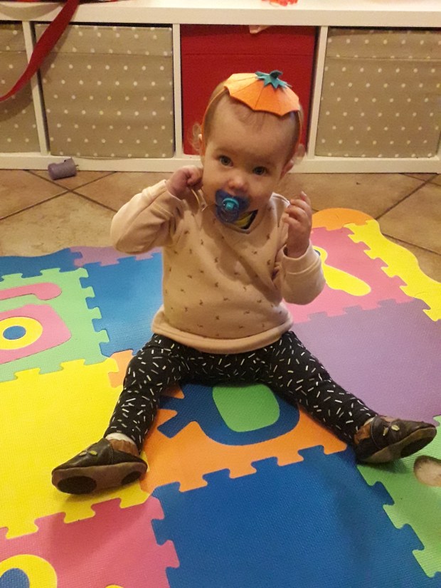Mijn klein pompoentje met Halloween. Een echt kostuum wilde ik voor haar niet kopen, maar dit kon ik gewoon niet laten liggen. Ze vond het zelf ook heel erg leuk om zichzelf zo in de spiegel te zien. Een succes dus!