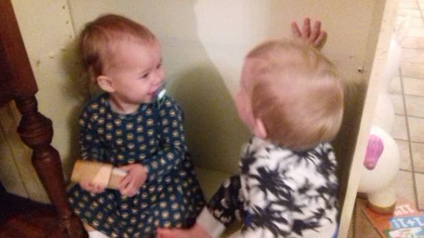 Lena speelt zo graag met Beau, hier zitten ze samen in de boekenkast, die hier meer dienst doet als bankje dan wat anders.