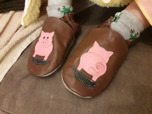 De mooie printjes/figuurtjes op de slofjes en de mooie, felle kleuren spraken me meteen aan. Ze spatten gewoon van het scherm af. Ook Pieter vond ze meteen geweldig toen hij ze zag en kon gewoon niet kiezen. Uiteindelijk ging hij toch voor de varkentjes. Want dat op het ene slofje de achterkant staat zorgt voor giechelbuien. Voor Lena koos ik superschattige giraffen.