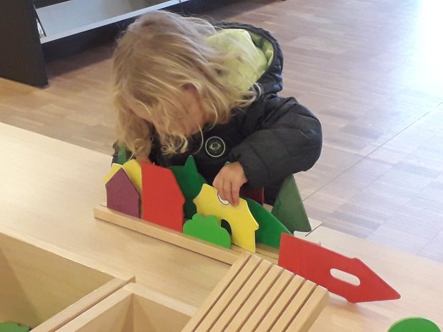 In het midden van het kindergedeelte staat een grote tafel met allerlei activiteiten. Kleuren, puzzelen, … . En deze leuke landschappen, waarbij je huizen en bomen in een houten onderstel plaatst om je eigen tafereel te maken. Dit was absoluut zijn favoriete activiteit, waarbij hij bijna niet was weg te slaan!