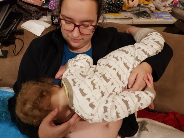 In deze houding wrong juffrouw Lena zich tijdens haar avondslokje. Altijd weer een avontuur om een grotere baby te voeden! Het is eens iets anders, nietwaar. Ik dacht met Pieter al alles te hebben gezien, maar deze houding is een primeur!