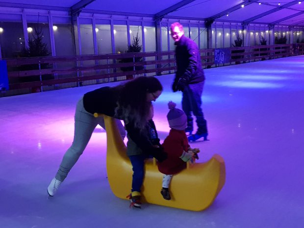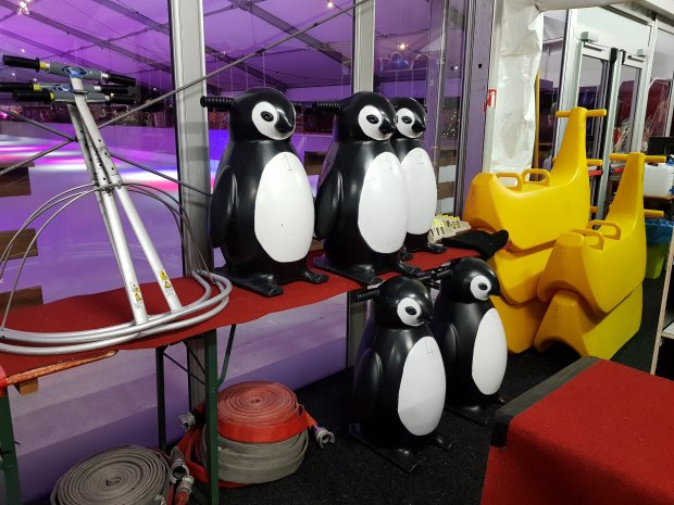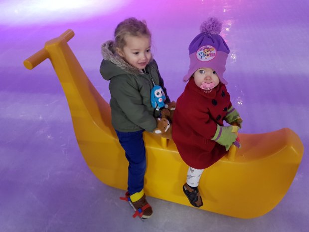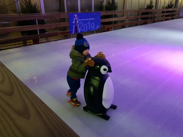 Op de schaatsbaan zijn verschillende soorten hulp voor de allerkleinste (en iets minder kleine) schaatsertjes. Pieter probeerde zowel de banaan als de pinguïn uit. Beide vindt hij een echt succes. Ook Lena nam even plaats op de banaan. Met veel plezier en gekraai. Met effectief schaatsen wachten we toch nog jaartje tot ze iets stabieler op haar beentjes staat.