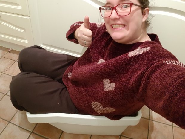 - De vloer moet dringend schoongemaakt worden na het knoeifestijn. Maar dat gaat even niet want er moet weer verschoond worden. Luier in de vuilbak.