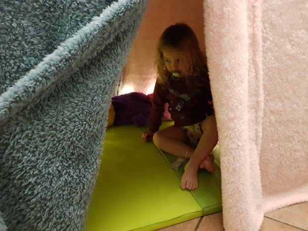 Ons tafeltent fort is een groot succes. En het is supersnel opgebouwd! Maar ook weer eenvoudig opgeruimd als we de tafel nodig hebben voor andere dingen. (Al is Pieter het daar niet mee eens, haha! Hij is dolgelukkig in zijn tent waar hij zich kan verstoppen.)