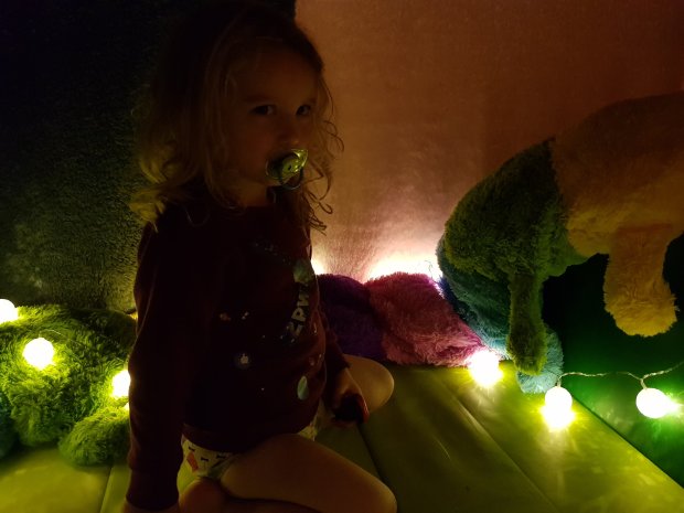 In onze tent ligt een speelmat van Ikea, zodat het lekker mals en warm is om te zitten. We hebben nogal een koude vloer, dus dat is geen overbodige luxe. De mat is perfect in de breedte en in de lengte komt hij aan een zijde rechtop tegen de tafelpoten aan als een soort zeteltje. Ook ligt de grote knuffelslang erin, die is superfijn om tegen te liggen! En om mee te knuffelen of overheen te klimmen. Als laatste zitten er 2 slingers met lampjes in. Zo is het niet te donker en kunnen we zien waarmee we spelen.