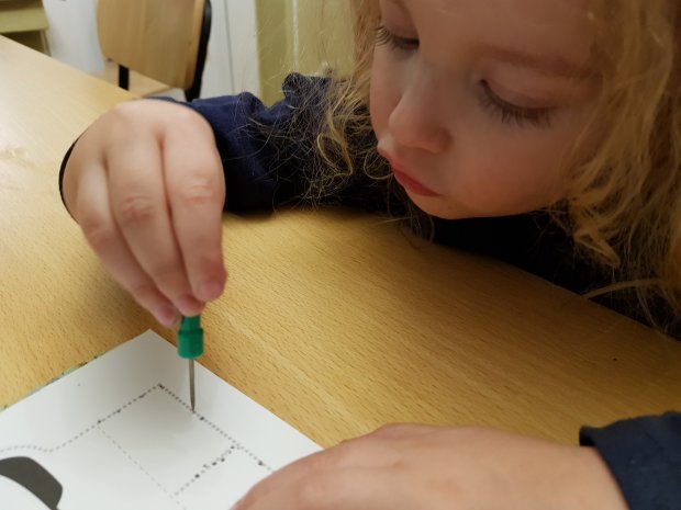 Het kost hem nog veel concentratie om goed op de puntjes te prikken, maar hij wil het wel gewoon heel goed doen. Na elke paar gaatjes zei hij trots dat hij “het wel heel goed gedaan heeft, he mama”. En dat is zo. Ik was zelfs verbaasd hoe snel hij ermee weg was! Ik deed het enkele gaatjes voor en hup, hij was vertrokken. En hij vond het nog leuk ook. Ook niet onbelangrijk natuurlijk!