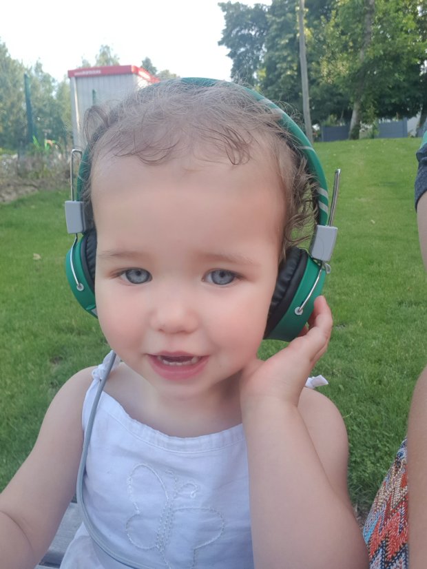Dit prutsemieke vind het geweldig om met mijn koptelefoon te gaan lopen. Er staat dan geen muziek op hoor, gewoon het op haar hoofd zetten ervan vind ze helemaal geweldig. Ik vind haar er enorm stoer en zomers uitzien op deze foto. Mijn kleine prinses!