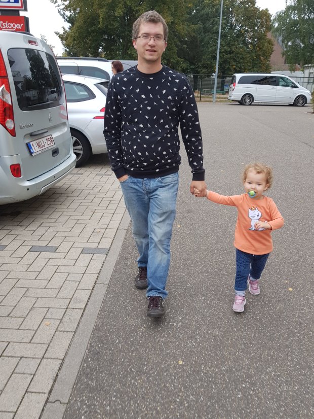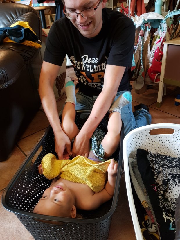 Deze foto deelde ik ook al op sociale media, maar ik vind hem zo leuk dat ik hem hier ook eens deel. Jelle z’n creatieve oplossing om dat klein, wriemelend wormpje even op haar plek te houden voor het aantrekken van een nieuwe luier en kleding. Ze is een kleine naturist, loopt liever in haar blootje rond. Thuis is dat prima, maar naar buiten is het iets minder aanvaard. Dus dan maar even op deze manier. Ik vind hem super.