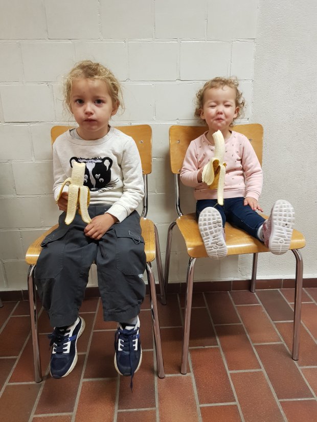 Samen wachten tot de balletles van Pieter begint. Ik zie zo erg dat ze elkaar nadoen. Pieter gaat zitten, Lena volgt hem. Lena wil een banaan eten, Pieter vraagt er ook eentje. …