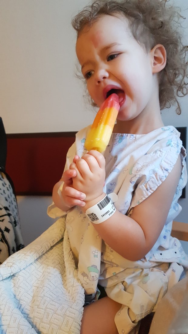 We mochten weer naar de kamer om te bekomen. Zodra ze wat water had gedronken zou Lena een ijsje krijgen. Maar die koppige doos van mij had geen zin in water. “Chocomelk!” was wat ze wilde hebben. Dat was echter nog wat te zwaar volgens de verpleegster. Ongeveer een uur onderhandelen later kwam er een andere verpleegster binnen, die meteen begreep dat het over dat water ging. Zij stelde voor om wat appelsap te drinken, en dat slokte ze naar binnen alsof haar leven er vanaf hing. Ook niet meer dan normaal, als je je bedenkt dat het al bijna middag was en ze nog steeds niets had gegeten of gedronken! Na het appelsap volgde haar ijsje en toen dat op was mochten we naar huis.