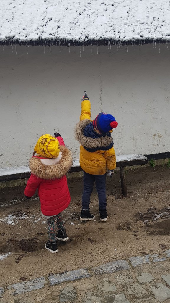 In het museum kozen we een heel korte route. Niet alleen de kindjes zouden het ander moeilijk volgehouden hebben, maar ook mijn bekkeninstabiliteit is helaas op korte tijd enorm achteruit gegaan. Kleine afstanden zoals naar het toilet of de koelkast zijn zelfs al moeilijk. Maar dat is een ander verhaal. De strooien daken in het museum leenden zich er enorm toe om ijspegels te laten groeien. Pieter en Lena vonden het dan ook alleen maar geweldig om ze te “plukken”. Hiervoor lieten ze zich door iedereen die maar wilde luisteren optillen. En die ijspegels dienden daarna als ijsjes. Euhm, jammie? Goed voor de weerstand zullen we maar zeggen.