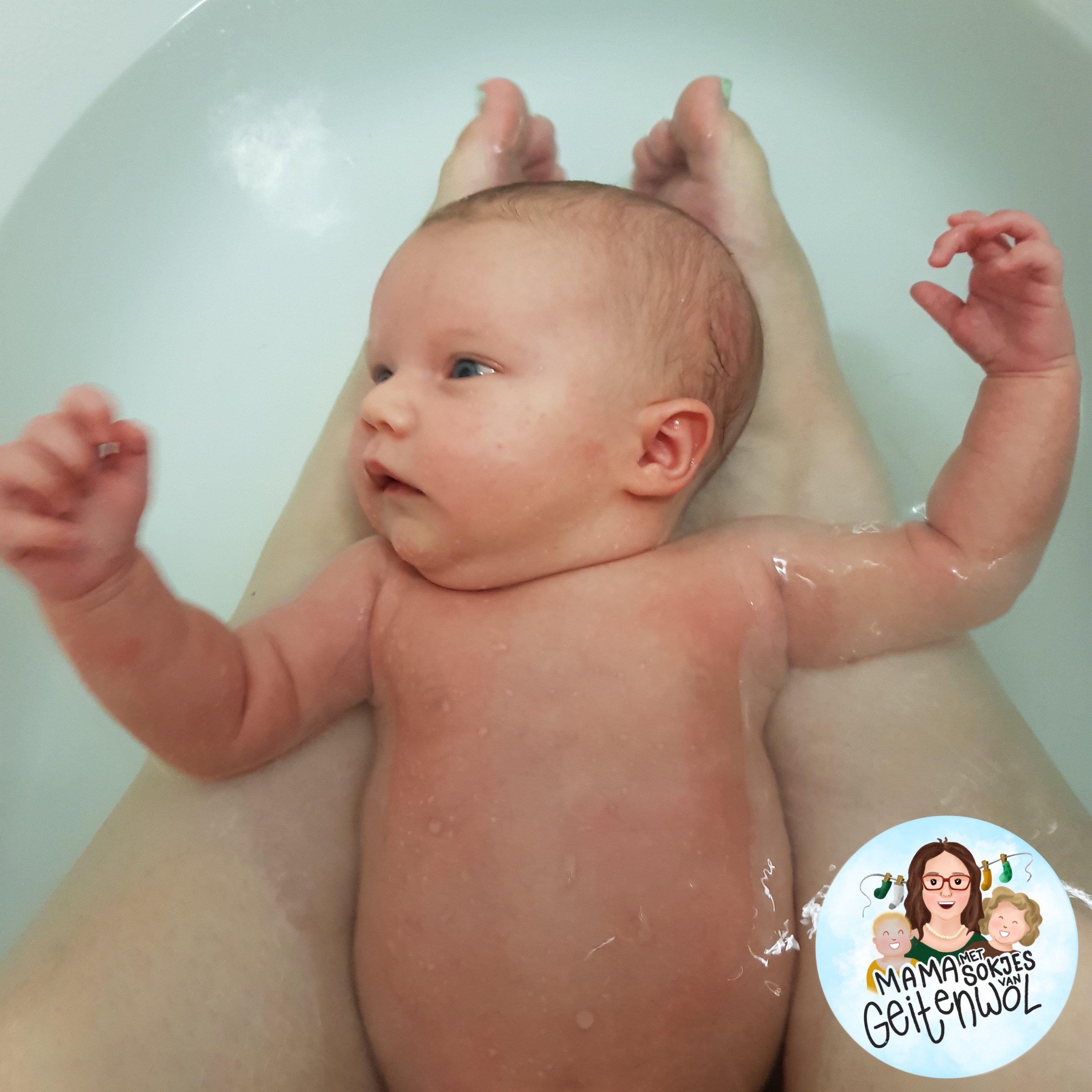 Na de massage ging ze voor het eerst in het grote bad! Wat een plezier.