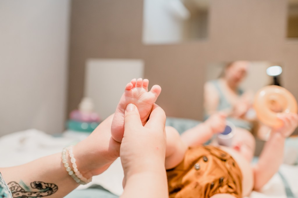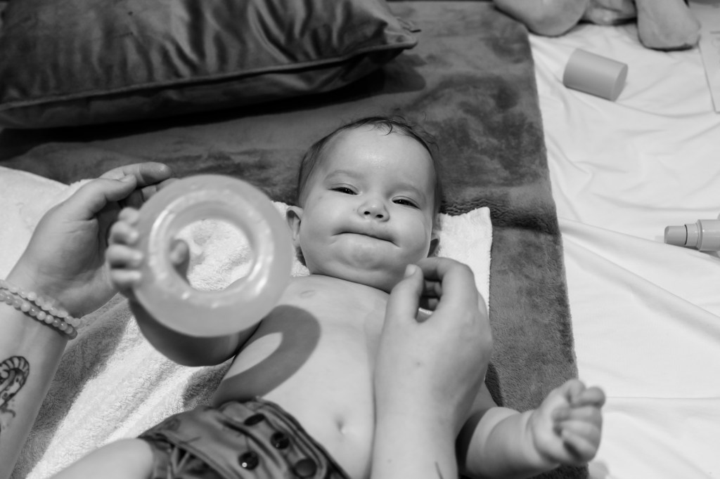 Van de massage heeft Emmelie wel enorm genoten. Ze was op het moment wel al voorbij de 8 maanden, waardoor stil liggen niet meer haar grootste hobby is. Nu ben ik het wel gewoon om met een gladde baby te werken (ze krijgt thuis ook wel eens massages met olie), maar het is wel iets om rekening mee te houden, zeker met een oudere baby! Voor die ondernemende wereldontdekkertjes heeft Femke ook wel enkele speelgoedjes liggen, en de dop van het flesje olie was ook enorm in trek.