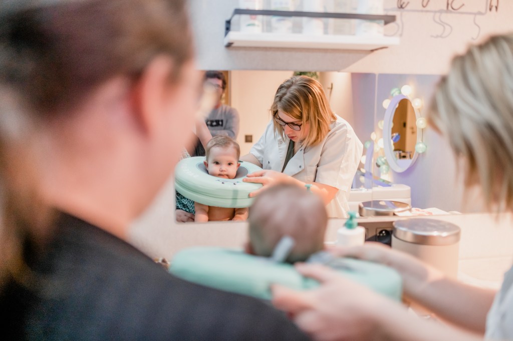 We werden heel warm onthaald (letterlijk en figuurlijk) door Femke en Celien. Emmelie kreeg de kans om even te ontdooien voor we haar omkleedden in haar zwemluiertje – deze zijn ter plaatse aanwezig, maar ik had er zelf eentje meegebracht. Dit omkleden gebeurde in de ruimte waar het bubbelbad staat, meteen al met gedempte verlichting. Daarna ging de zwemband aan. Op het eerste zicht leek ze dit heel goed toe te laten, maar na een beetje wriemelen was het toch maar vreemd en eng, zo’n ding rond haar nek.