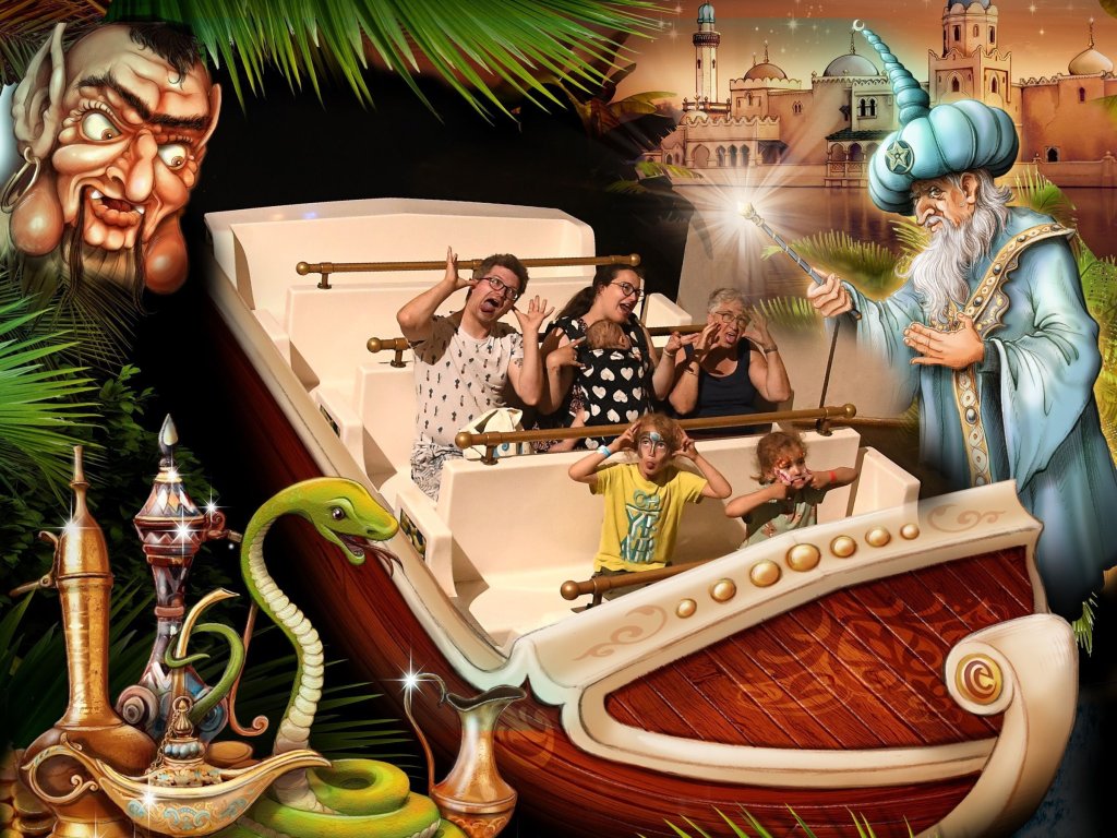 Buiten stond de Djin ons al op te wachten. De kinderen konden (echt!) een praatje maken en op de foto. Elke dag wilden ze wel even hoi gaan zeggen, Djin (Jim, zoals Lena zegt) is hun vriend. Fijn dat hij buiten al stond om kennis te maken, want binnen is hij best indrukwekkend. De rondvaart van Fata Morgana is magisch. Overal is wel wat te zien. We hebben tijdens ons verblijf zeker 5 ritjes gedaan, als het er niet meer zijn. Aan het einde van de dag is het er vaak rustig, waardoor blijven zitten mogelijk is! Pieter en Lena hebben met verbazing steeds nieuwe dingen ontdekt. Emmelie heeft het boottochtje op allerlei manieren meegemaakt. Slapend, op schoot, op het bankje, … Ze vond het prachtig! Deze attractie is best donker, maar dat helpt alleen maar aan de sfeer. Helaas konden we door werken de buitenkant niet helemaal bewonderen, maar dat komt de volgende keer wel weer!
